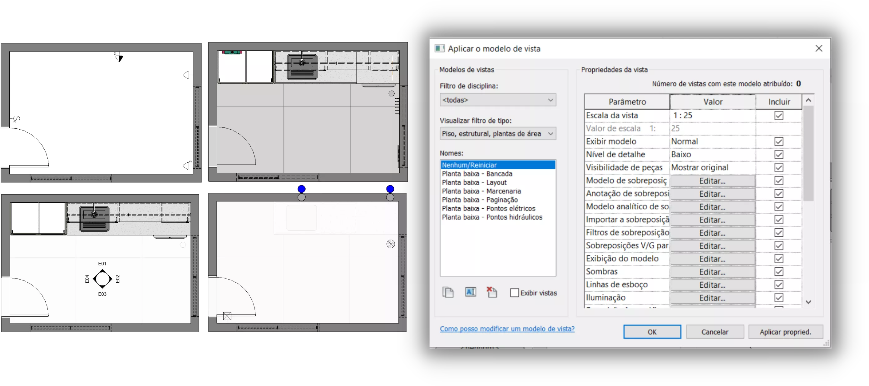Modelos de vistas pré-configurados para aceleração de projetos executivos de interiores. Com apenas 1 clique você consegue trocar as configurações visuais da vista, dando destaque e exibição ao que importa para aquele desenho. Além da velocidade, você garante padronização e boa comunicação em seus detalhamentos.
