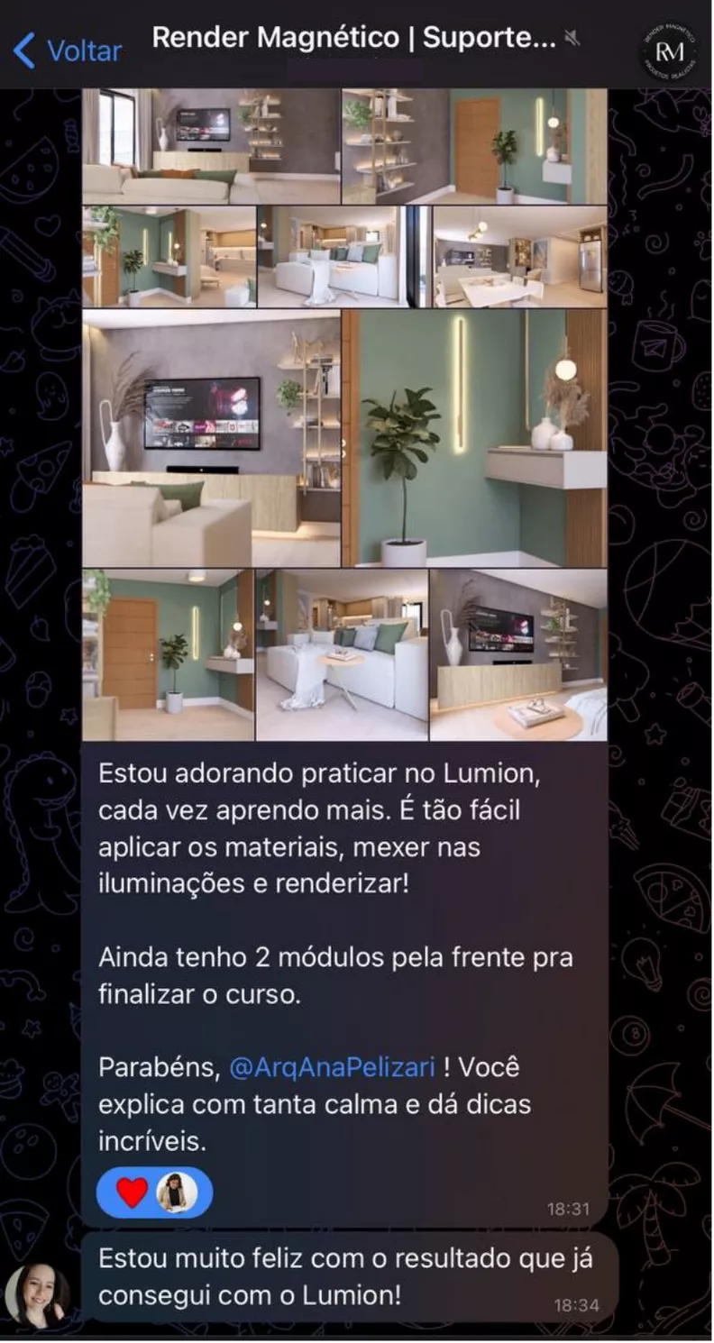 Gigi é coprodutora do curso Render Magnético e participou de toda a concepção do conteúdo, desde o planejamento das aulas até a estrutura de ensino, garantindo o mesmo padrão de qualidade que tornou seus treinamentos reconhecidos por entregarem resultados reais, rápidos e aplicáveis no dia a dia do profissional.